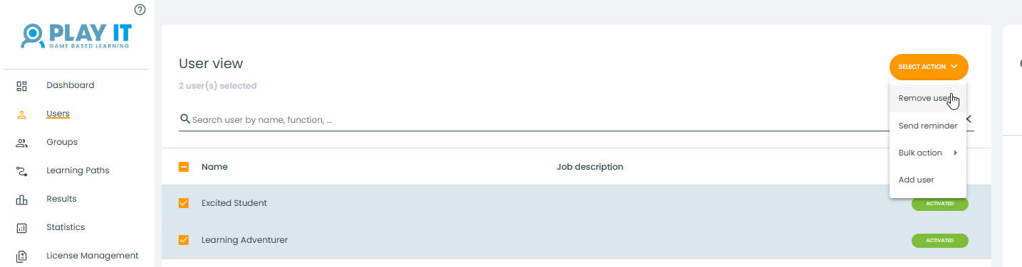 When you have selected all the users you want to delete, you can click on the 'Select action' button and choose 'Remove Users'.