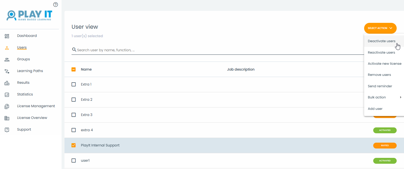 Select the user you want to deactivate and click on 'Select Action' and click on 'Deactivate users'