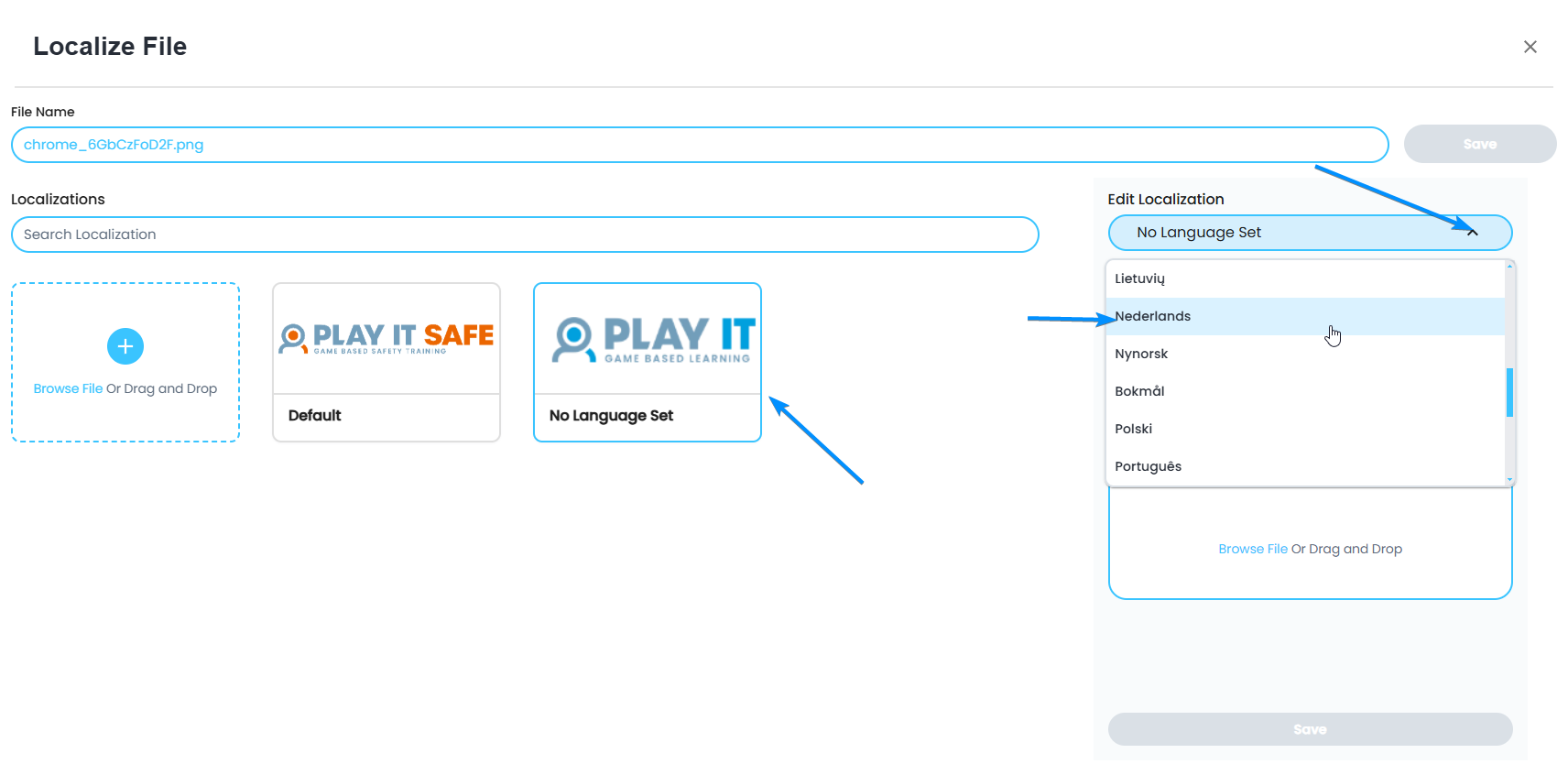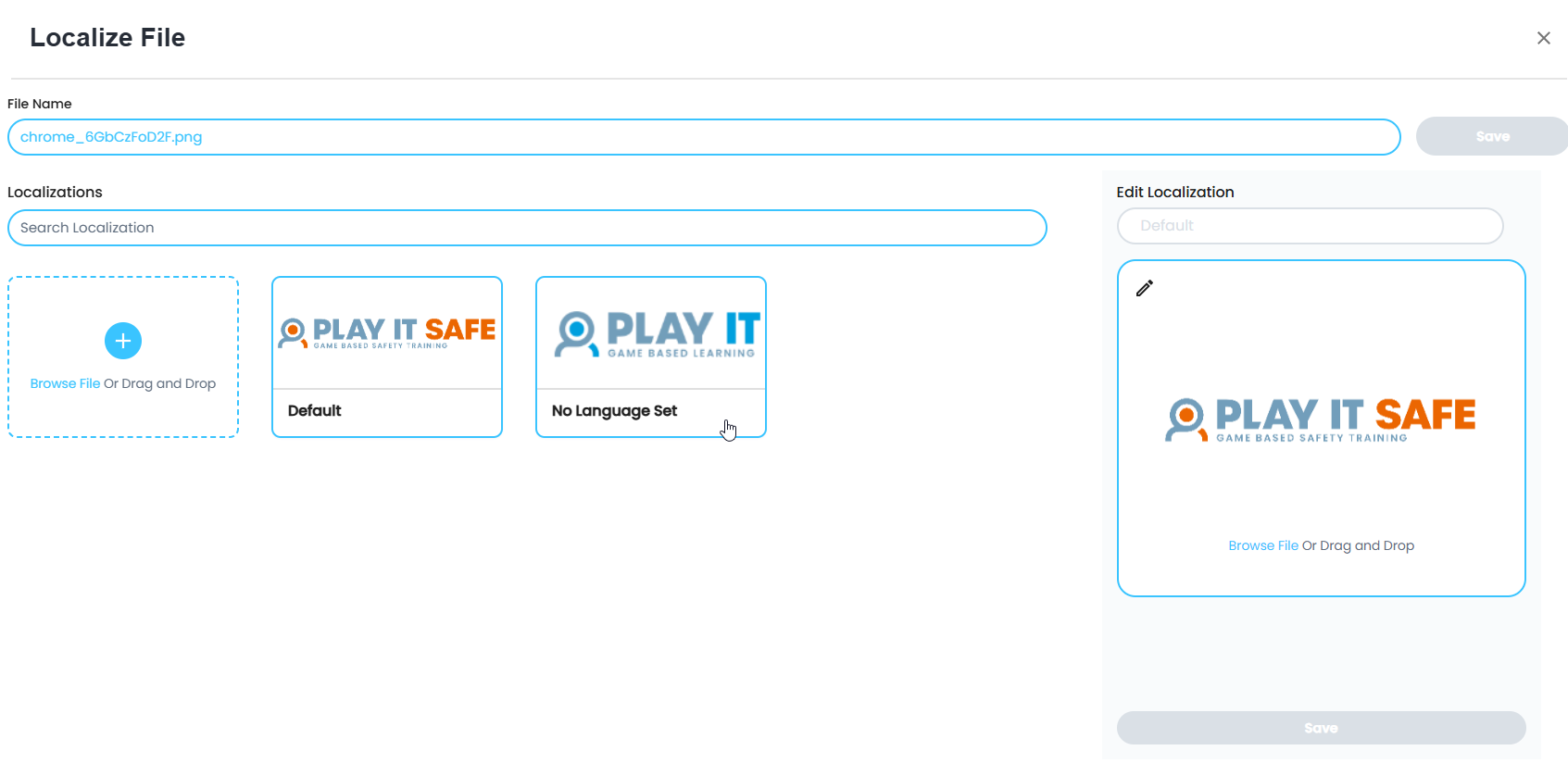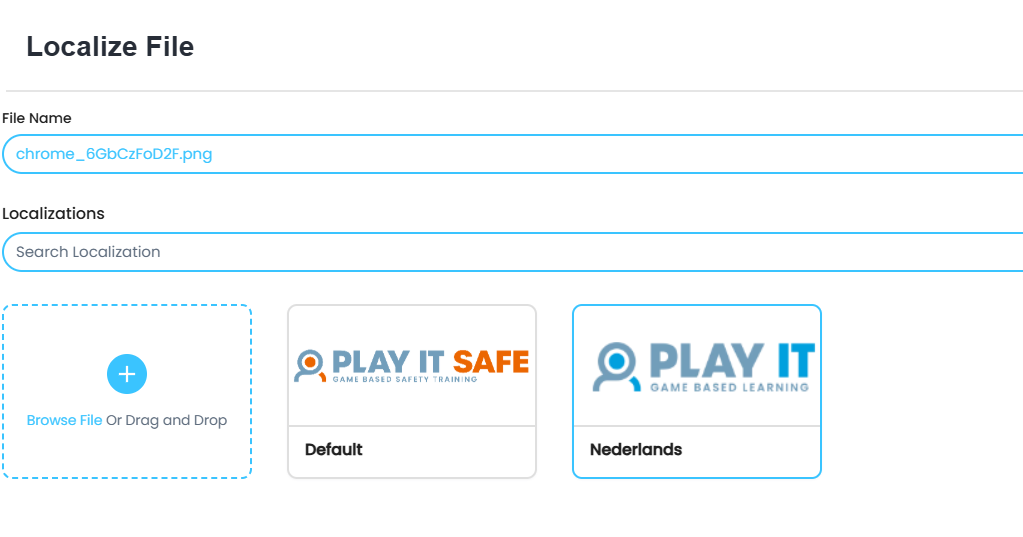 - In 'Localize File', you can upload several versions of the assets. Once uploaded you'll see the default picture and the second version where no language has been set yet