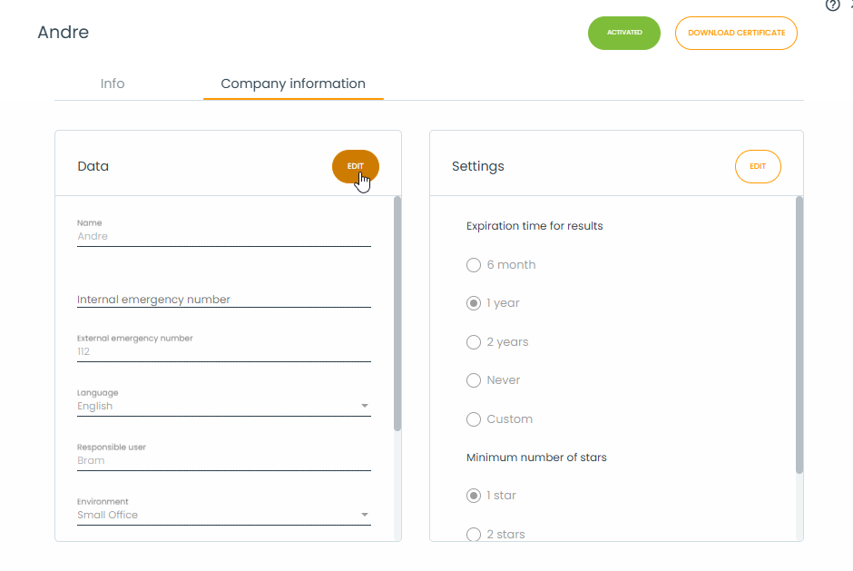 In the 'Data' column you see info such as the name, logo, default language (for the portal), as well as the internal and external emergency number to be used during the training and the standard environment in which the training is played.