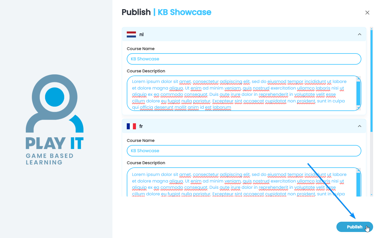 - Fill in the 'Publish' pop-up with the course name and course description in the three standard languages: Dutch, French and English. Only once all three languages are filled in, you can click on 'Publish'