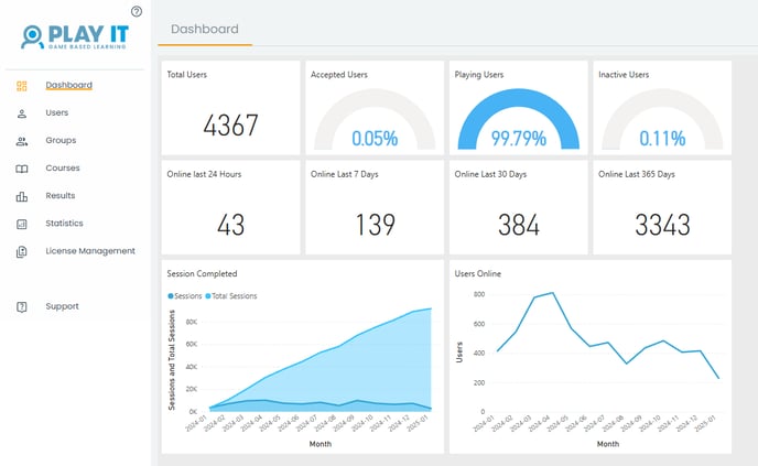 - Spelende gebruikers: Deze gebruikers hebben minstens één cursus gespeeld.