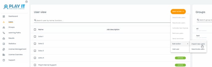 Ga naar het tabblad "Gebruikers" en klik op "Selecteer actie" -> "Bulkactie" -> "Importeer nieuwe gebruikers".