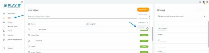 U kunt op de pagina 'Cursisten' een gebruiker toevoegen door op de knop 'Selecteer Actie' te klikken.