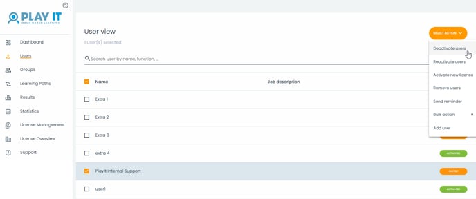 Selecteer de gebruiker die je wilt deactiveren en klik op 'Selecteer actie' en klik op 'Gebruikers deactiveren'.