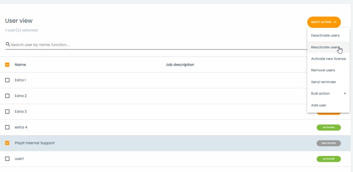 Selecteer de gebruiker die je wilt activeren en klik op 'Selecteer actie' en klik op 'Gebruikers heractiveren'.