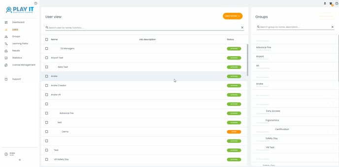 Here you find an overview of all users. These are listed alphabetically arranged and contain 3 columns: Name, Job description and Status.