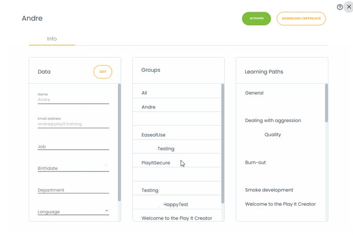 By using the 'Edit' button you can change the personal info, the preferred language and the role of the user.- Data: Here you can find and edit personal information about the user.